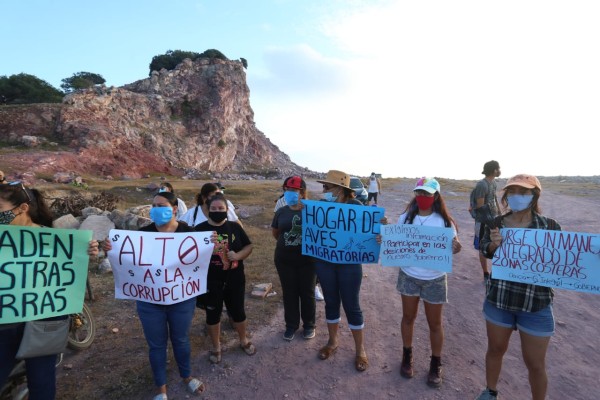 Vecinos de la Isla de la Piedra se manifestaron esta tarde para exigir que se detenga una construcción en la falda de la Isla de Chivos, porque consideran que afecta a este lugar protegido y sagrado para culturas prehispánicas.