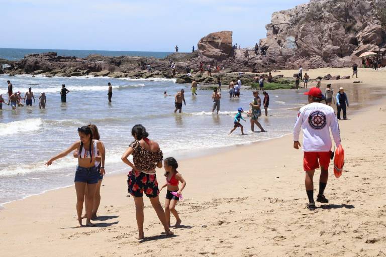 En Playa Brujas, en Mazatlán, salvavidas piden a bañistas llegar hasta donde tengan ‘el agua a la cintura’, no más