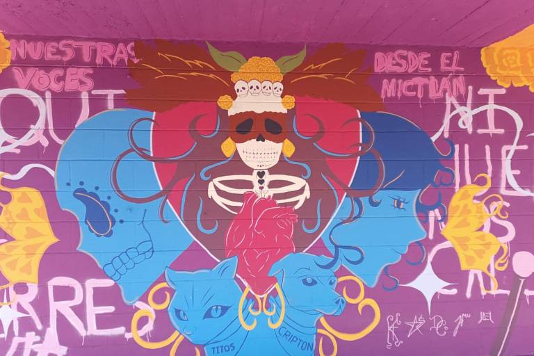 “En todos los murales que hacemos tratamos de integrar a la comunidad, a infancias, a que participen. Y en este caso, aquí en el panteón nos comentaron que las mascotas son como muy los jefes, o sea, son parte de aquí. Entonces fue trabajo de las artistas tratar de integrarlos para que este mural tuviera más identidad tal cual aquí al panteón”.