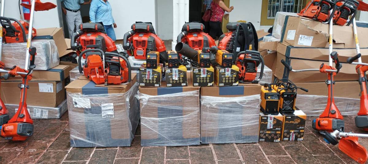 La maquinaria adquirida fue 35 desbrozadoras, 10 motosierras, 8 sopladoras, 4 inversoras de electrodo y 2 máquinas para soldar, que fueron recibidas por Julián Cedano en representación del departamento de Parques y Jardines.