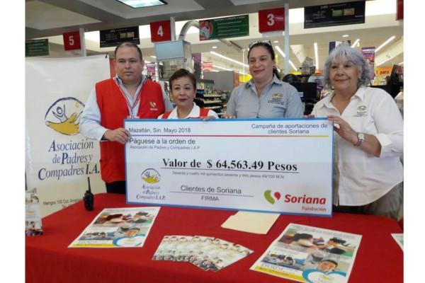 MAZATLÁN._ De centavo en centavo, clientes de las tiendas Soriana lograron reunir 64 mil 563 pesos para la Asociación Padres y Compadres, producto de los donativos de sus clientes a través del programa de redondeo Ayuda a Ayudar.