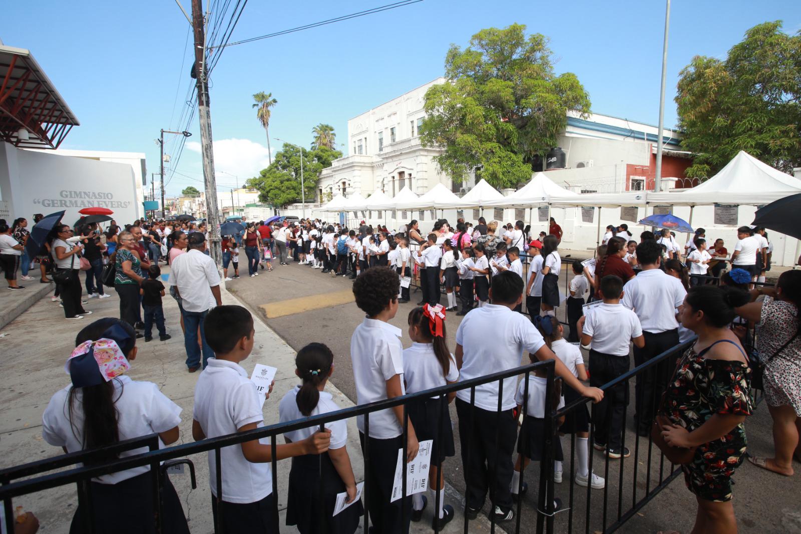 Desde temprana hora, padres de familia, acompañados de sus hijos, se dieron cita a la cancha Germán Evers para recibir el apoyo bimestral.
