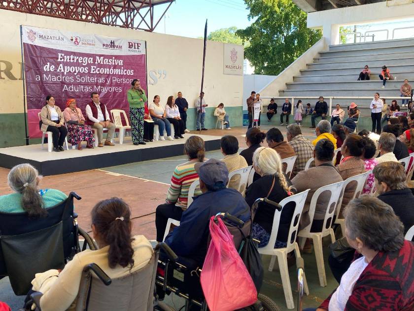Apoyos económicos para Adultos Mayores y Madres Solteras Jefas de Familia fueron entregados este lunes por el Gobierno de Mazatlán a través del Sistema para el Desarrollo Integral de la Familia, DIF Municipal, en un evento masivo en la cancha Germán Evers.