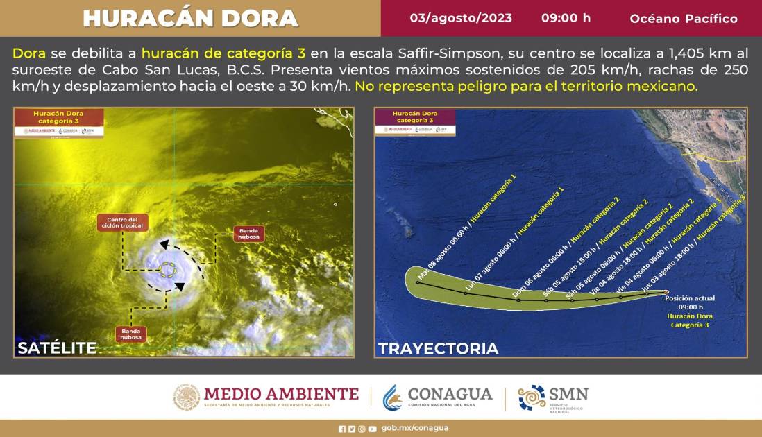 El ciclón “Dora” se intensificó durante la noche del miércoles a huracán de categoría 3 en la escala Saffir-Simpson y la madrugada de este jueves se incrementó a categoría 4, pero a las 9:00 horas bajó nuevamente a huracán categoría 3, de acuerdo con el Servicio Meteorológico Nacional del Agua.