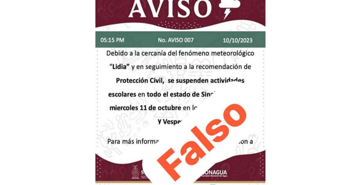 Ante la circulación de un aviso de una supuesta suspensión de actividades escolares para el miércoles 11 de octubre, el Gobierno de Sinaloa aclaró que tal ficha es falsa y que habrá clases en todos los planteles escolares de los 18 municipios.