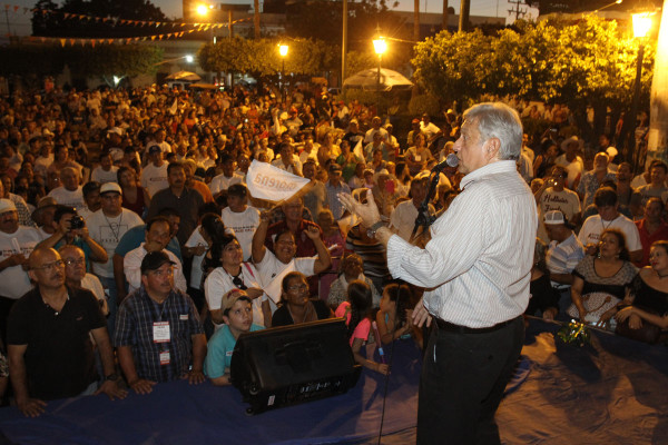 Ante cientos de simpatizantes, abordó algunos de sus proyectos de regeneración nacional en temas de corrupción, desempleo, programas sociales para adultos mayores, y refrendó su apoyo al magisterio.