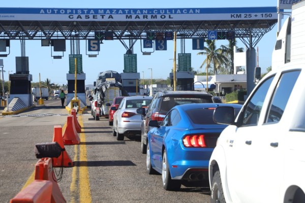 Entre las 14:00 y las 15:00 horas se observó que se formaban dos hileras de hasta 15 unidades automotores para cruzar la caseta rumbo a Culiacán, mientras que para pasar rumbo a Mazatlán el tránsito era menor, en ocasiones de una a cinco unidades.