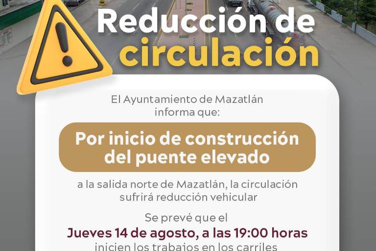 MAZATLÁN._ Tome sus precauciones. Mañana jueves 14 de agosto inician de los trabajos de construcción del puente vehicular en el crucero de la Plaza Acaya, en carretera Internacional al norte y Libramiento Pérez Escobosa.