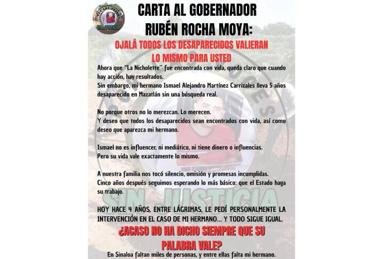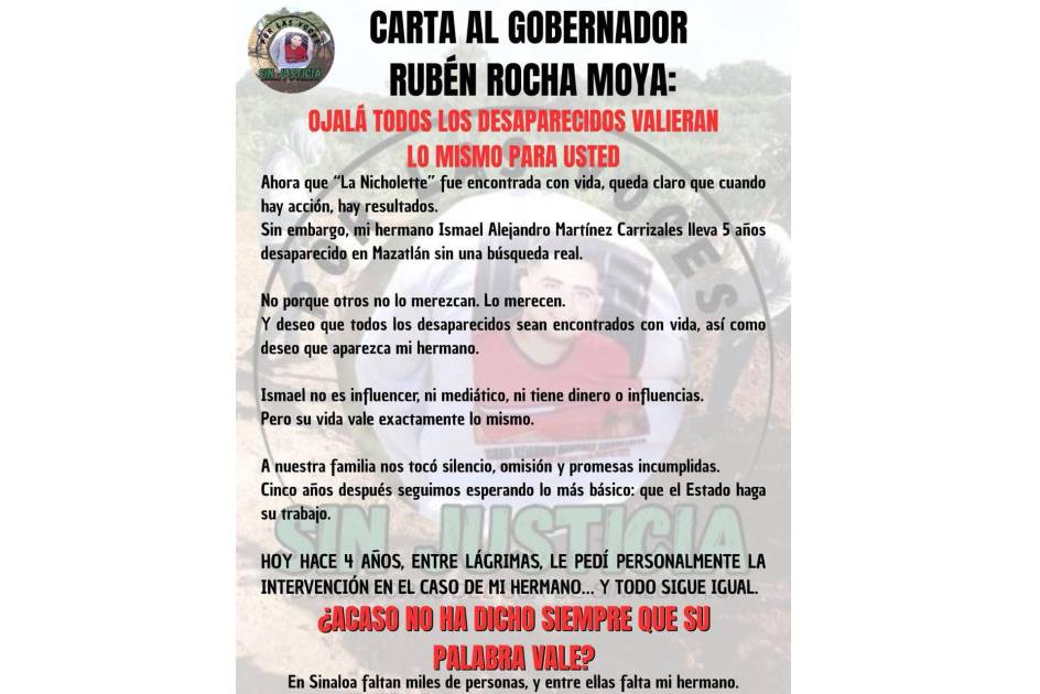 “Ahora que ‘La Nicholette’ fue encontrada con vida, queda claro que cuando hay acción, hay resultados. Sin embargo, mi hermano Ismael Alejandro Martínez Carrizales lleva 5 años desaparecido en Mazatlán sin una búsqueda real”, se lee en la carta.