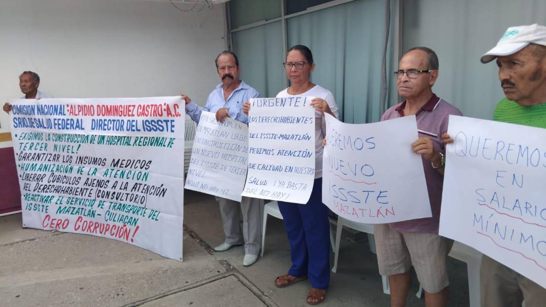 MAZATLÁN._ En exigencia de una atención médica de calidad, abasto de medicamentos y la creación de un hospital de tercer nivel, integrantes de la Comisión Nacional de Trabajadores Jubilados “Elpidio Domínguez Castro” se manifestarion este jueves frente a la clínica del ISSSTE en Mazatlán.