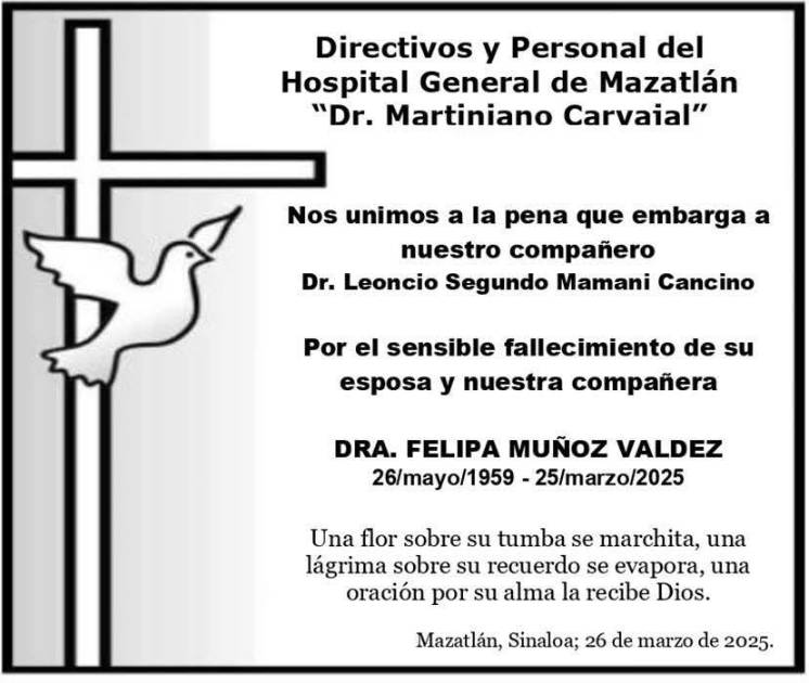 En redes sociales, tanto el Hospital General como el Colegio de Ginecología y Obstetricia de Mazatlán expresaron sus condolencias a los familiares y seres queridos de la doctora Felipa Muñoz Valdez.