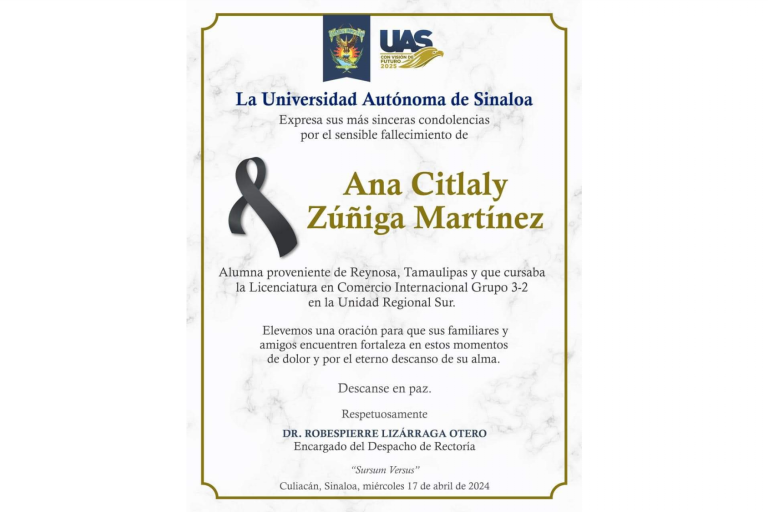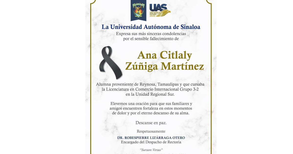 Ana Citlaly estudiaba el tercer año de la Licenciatura en Comercio Internacional en la Facultad de Ciencias Sociales de la Universidad Autónoma de Sinaloa, casa de estudios que extendió sus condolencias.