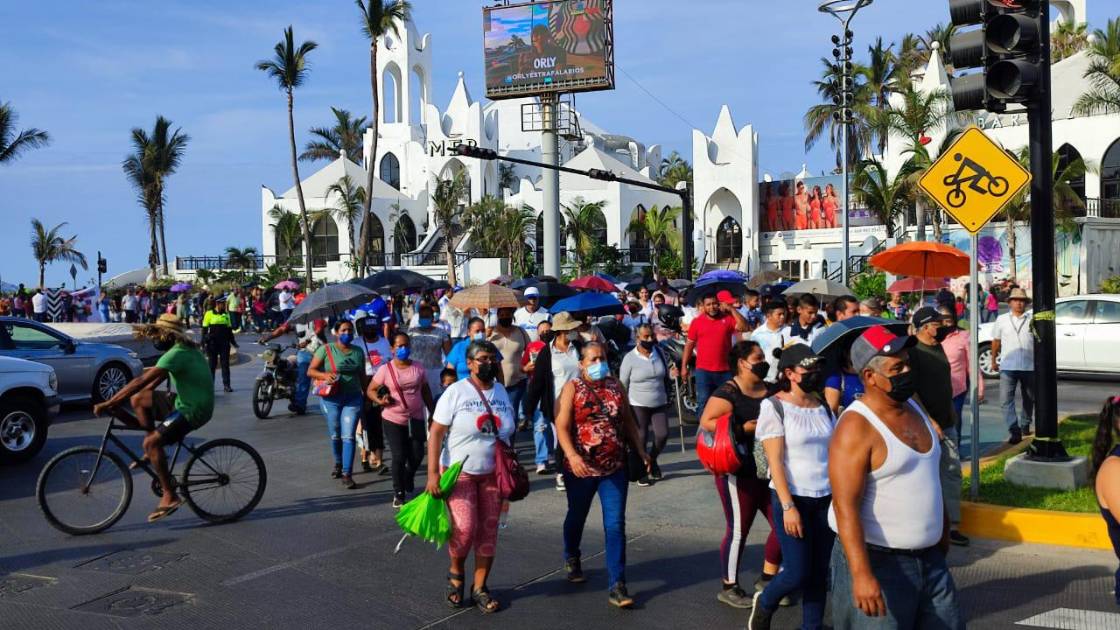 MAZATLÁN._ De manera intermitente, cientos de desplazados por la violencia que radican en Mazatlán han bloqueado la Avenida Camarón Sábalo la mañana de este domingo.