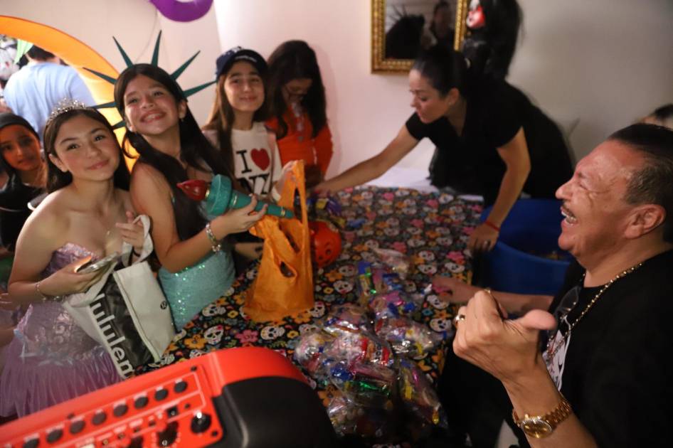 Ante él, muchos pequeños llegan gritando “dulce o truco” o “queremos Halloween”, por lo que el cantante muy contento repartió miles de dulces en este día tan especial.