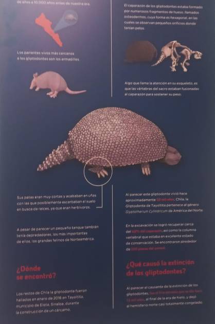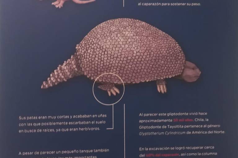 El gliptodonte, explicó es parecido a un armadillo gigante, era un herbívoro que podía alcanzar hasta 3 metros de longitud y 1.3 metros de altura en su caparazón.
