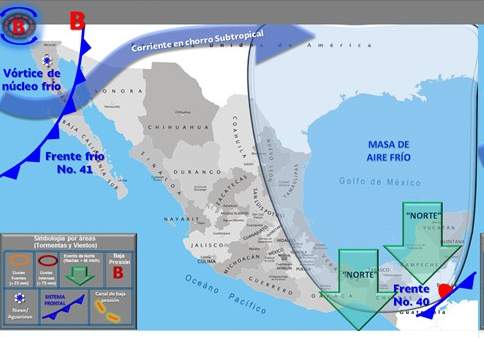 El SMN también dio a conocer que durante el domingo 23 el frente frío 41 recorrerá el noroeste y norte de México, en interacción con el vórtice de núcleo frío localizado al sur de Estados Unidos, y con el arrastre de humedad asociado a la corriente en chorro, provocarán lluvias aisladas, descenso de temperaturas y rachas fuertes de viento sobre las regiones mencionadas.