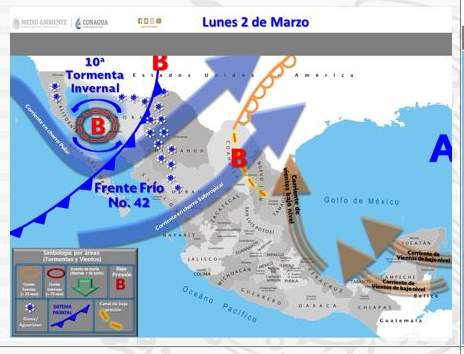 El SMN también dio a conocer que de las 8:00 horas de hoy a las 8:00 horas de mañana martes, el frente frío 42 y la Décima Tormenta Invernal de la temporada recorrerán el noroeste y norte del país.