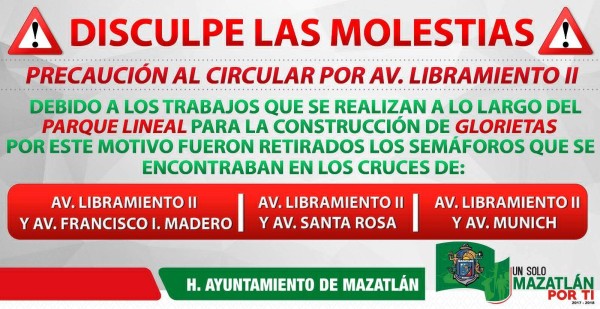 “A través de la Dirección de Obras Públicas pide a los automovilistas tener precaución al circular por el Libramiento II, ya que debido a la construcción de glorietas fueron retirados los semáforos... hay que reubicar esos semáforos, ya que se terminen los trabajos se van a volver a ubicar”, indica el informe que ya se difunde por redes sociales.