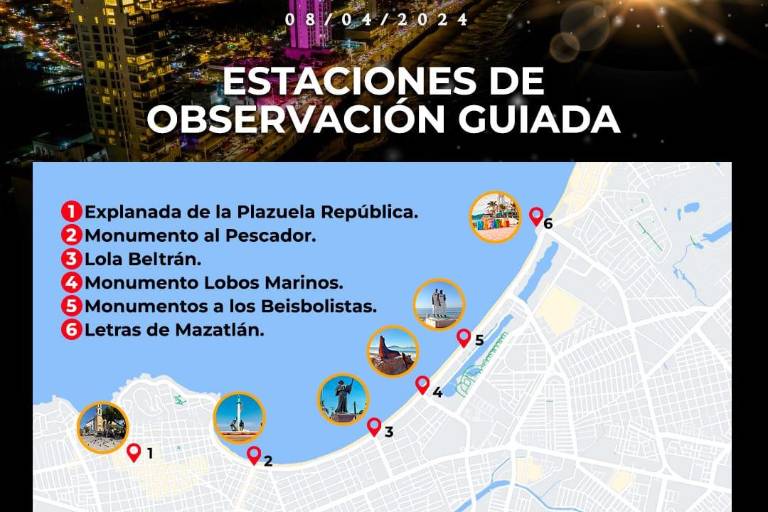 MAZATLÁN._ Serán seis estaciones de observación guiadas las que estarán dando servicio este lunes 8 de abril, para ver de forma segura el Eclipse Total de Sol. Cinco estarán a lo largo de la Avenida del Mar y una más en la Plazuela República.