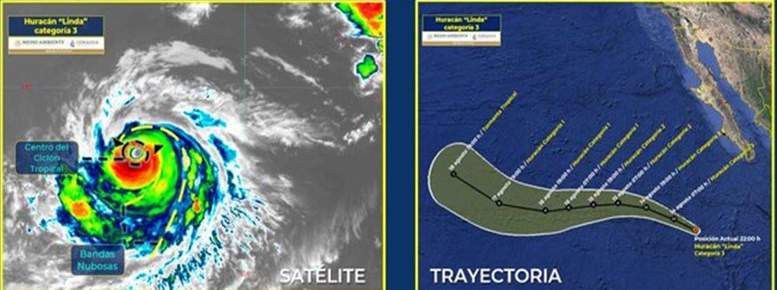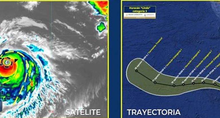MAZATLÁN._ El Huracán Linda, que a las 22:00 horas de ayer se degradó de categoría 4 a 3 en la escala de Saffir-Simpson, se localizó este domingo al oeste-suroeste de Cabo San Lucas, Baja California Sur, de acuerdo con el Servicio Meteorológico Nacional de la Comisión Nacional del Agua.