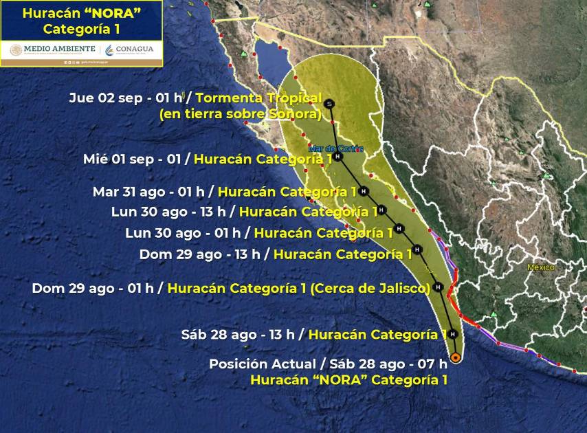 En SMN pronosticó que para las 7:00 horas del domingo 29 de agosto el huracán “Nora” de categoría 1 en la escala de Saffir-Simpson se localizará a 95 kilómetros al oeste-suroeste de El Roblito, Nayarit, y a 125 kilómetros al sur-suroeste de Escuinapa, Sinaloa