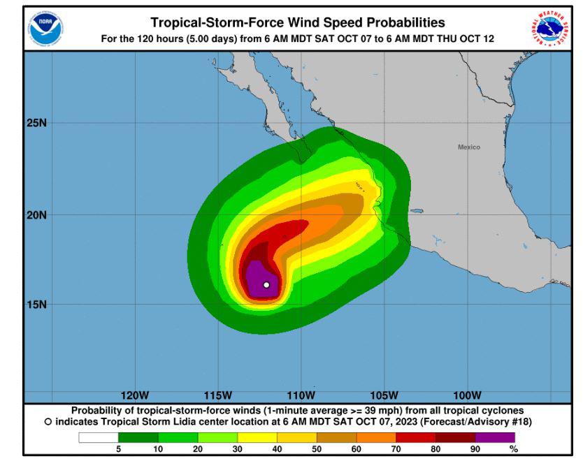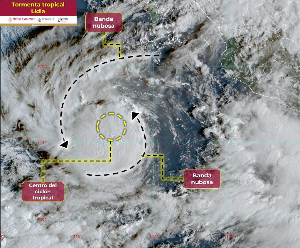 La amplia circulación de “Lidia” ocasionará lluvias puntuales intensas, viento fuerte y oleaje elevado en Baja California Sur, además reforzará la probabilidad de lluvias puntuales muy fuertes a intensas en Sinaloa, Nayarit, Jalisco y Colima.