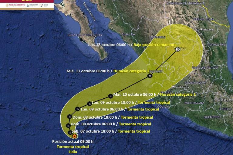 MAZATLÁN._ La tormenta tropical Lidia curvea y se perfila rumbo al norte de Nayarit, y de acuerdo al pronóstico de trayectoria impactaría como huracán categoría 1 en los primeros minutos del miércoles, con afectaciones de lluvias fuertes en el sur de Sinaloa, informó el Servicio Meteorológico Nacional en su aviso 18, emitido a las 08:15 horas (tiempo local) de este sábado 7 de octubre.