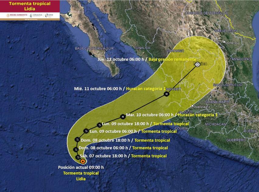 A las 08:15 horas de este sábado “Lidia” se encontraba a 780 kilómetros al sur-suroeste de Cabo San Lucas, Baja California Sur y a 835 kilómetros al oeste-suroeste de Cabo Corrientes, Jalisco.