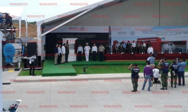 Peña Nieto, acompañado por los titulares de la Secretaría de la Defensa Nacional, General Salvador Cienfuegos Zepeda; y de la Secretaría de Marina Armada de México, Almirante Vidal Francisco Soberón Sanz, además del secretario de Salud, José Ramón Narro Robles; y del titular de la Sagarpa, José Calzada Rovirosa, además del Gobernador de Sinaloa, Mario López Valdez, y del Alcalde de Mazatlán, Carlos Felton, develaron la placa e inauguraron este nuevo nosocomio militar en Mazatlán.