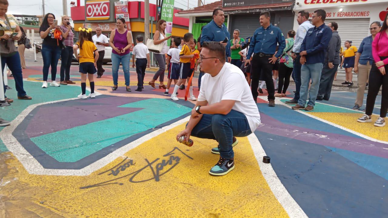 En dicho crucero además del pintado de las rayas de cebra por donde deben cruzar los peatones, el artista Carlos Loaiza, dijo que no solamente fue intervención suya en la parte artística, sino mucho principalmente de niños y jóvenes de las escuelas Secundaria 2, primarias, entre otras.
