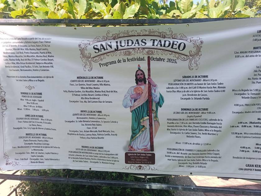 Además, ese día también se realizará la tradicional “Procesión por las calles del Fraccionamiento Sábalo Country” en punto de las 16:00 horas. Mientras que las mañanitas a San Judas Tadeo serán a las 6:00 horas, y la misa especial oficiada por el Señor Obispo Mario Espinosa tendrá horario de 12:00 horas.