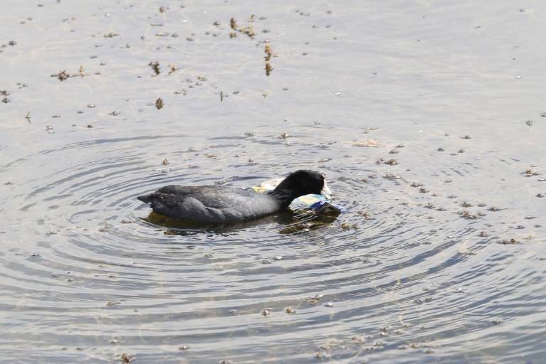 Ahí en la orilla de la laguna y dentro del agua se ven los desechos, incluso se vio esta mañana a un patito comiendo en una bolsa de plástico de galletas.