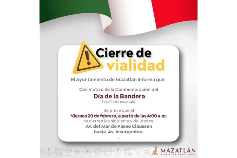 MAZATLÁN._ Con motivo de la conmemoración del aniversario del Día de la Bandera de México, la Secretaría de Seguridad Pública Municipal, a través de la Unidad de Vialidad, informa que la mañana de este viernes se realizará el cierre parcial a la circulación sobre la Avenida del Mar.