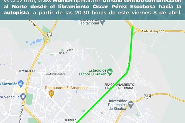 “Para evitar congestionamiento vial posterior al partido Mazatlán FC Vs Cruz Azul, la av, Múnich operará en un solo sentido con dirección al norte desde el libramiento Óscar Pérez Escobosa hacia la autopista, a partir de las 20:30 horas de este viernes 8 de abril”, se lee en el gráfico promovido en redes sociales oficiales.