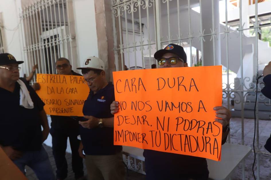 Con cadena y candado cerraron las rejas del acceso principal y luego del portón de la 5 de mayo por el grupo del colectivo Guerreros Azules apoyando a un promedio de 100 que pertenecen a la corporación de todo el estado incluyendo a los de Mazatlán pidiéndole a la Alcaldesa Estrella Palacios los atendiera pero lo señalaron entre cartulinas y consignas.