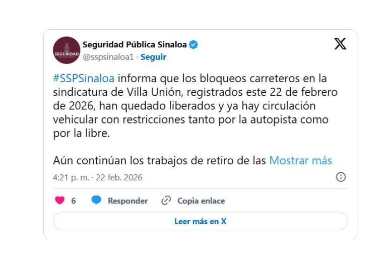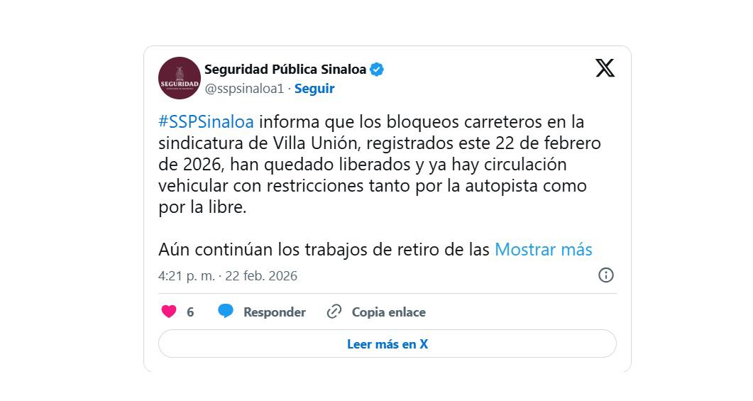 Tras los incidentes registrados este 22 de febrero del 2026, la Secretaría de Seguridad Pública de Sinaloa reportó que los bloqueos carreteros en la sindicatura de Villa Unión han sido liberados, estableciéndose el flujo vehicular en la zona con restricciones.