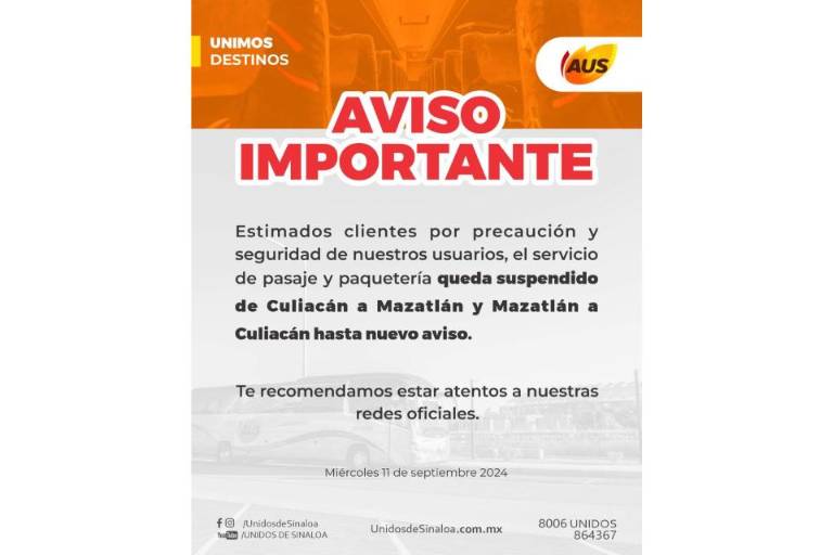 “Aviso importante. Estimados clientes por precaución y seguridad de nuestros usuarios, el servicio de pasaje y paquetería queda suspendido de Culiacán a Mazatlán y Mazatlán a Culiacán hasta nuevo aviso. Te recomendamos estar atentos a nuestras redes oficiales”, se leyó en el aviso.