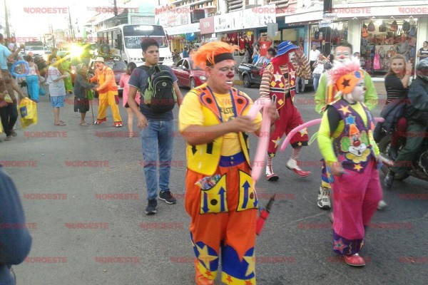 MAZATLÁN._ Integrantes de la Asociación de Payasos Unidos de Mazatlán, acompañados de sus familiares y amigos, realizaron ayer por la tarde en diversas calles del Centro de la ciudad un desfile para celebrar el Día Nacional del Payaso.
