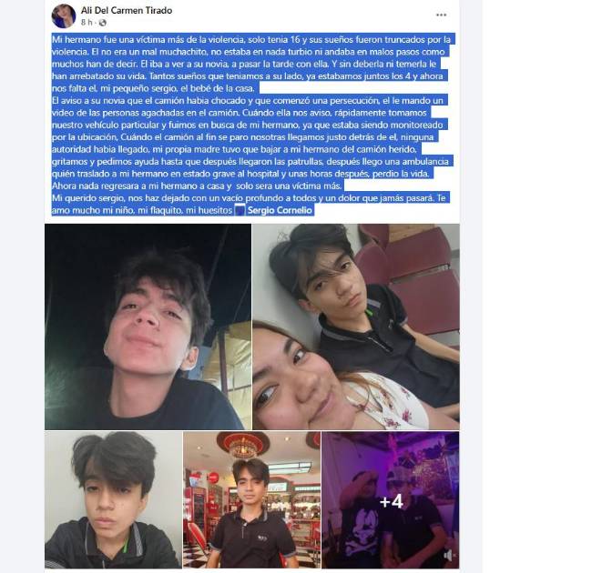 “Mi hermano fue una víctima más de la violencia, solo tenia 16 y sus sueños fueron truncados por la violencia. El no era un mal muchachito, no estaba en nada turbio ni andaba en malos pasos como muchos han de decir. El iba a ver a su novia, a pasar la tarde con ella. Y sin deberla ni temerla le han arrebatado su vida. Tantos sueños que teníamos a su lado, ya estábamos juntos los 4 y ahora nos falta el, mi pequeño Sergio, el bebé de la casa”, dice textualmente el mensaje de Alí.