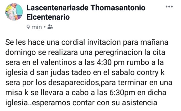 “Será una misa por los desaparecidos para terminar en una misa, que se llevará a cabo a las 6:30 pm, en dicha iglesia, esperamos contar con su asistencia”, señala.