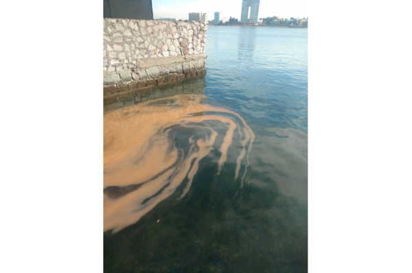 Desde las 08:00 horas de este viernes, personal de la Facimar detectó la coloración del agua y la mancha que se dispersaba formando figura de una nube en movimiento. De inmediato, al hacer el muestreo se descartó el derrame de alguna sustancia, pues el olor que emanaba era a pescado.