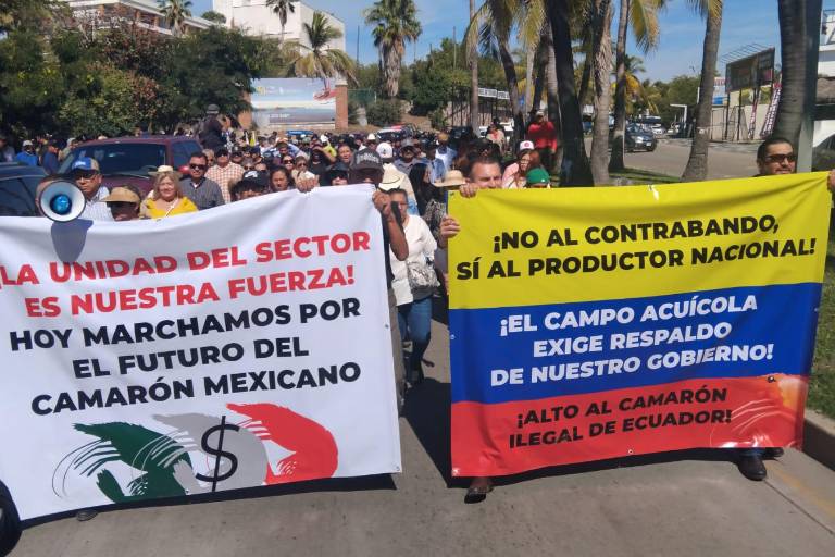 Cientos de productores acuícolas marcharon en Mazatlán exigiendo a la Presidenta Claudia Sheinbaum Pardo el cierre de fronteras al contrabando de camarón.