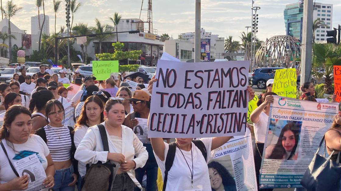 Portando pancartas con mensajes como “Aún nos faltan 2”, “Hasta encontrarte Tía Cecilia”, “No estamos todas, nos faltan Cecilia y Cristina” o “Las queremos de regreso”, las decenas de personas recorrieron la Avenida del Mar, captando la mirada de locales y turistas que recorrían el malecón de Mazatlán.