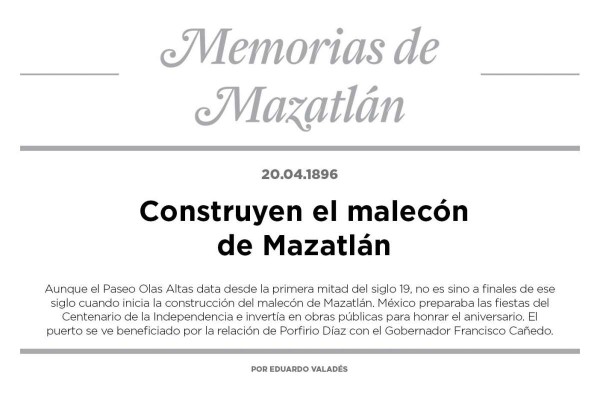 "Aunque el Paseo Olas Altas data desde la primera mitad del siglo 19, no es sino a finales de ese siglo cuando inicia la construcción del malecón de Mazatlán. México preparaba las fiestas del Centenario de la Independencia e invertía en obras públicas para honrar el aniversario. El puerto se ve beneficiado por la relación de Porfirio Díaz con el Gobernador Francisco Cañedo"