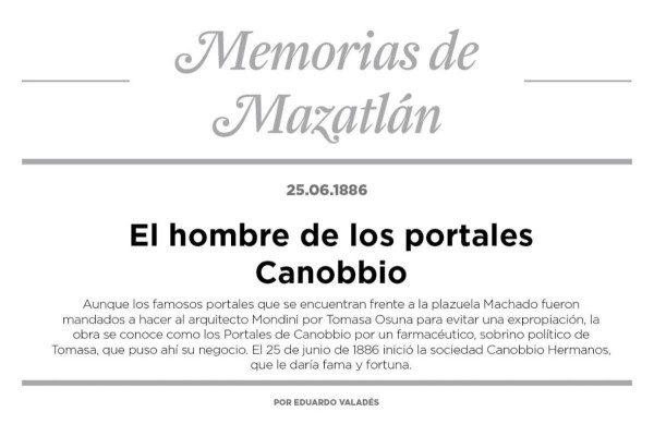 "Aunque los famosos portales que se encuentran frente a la plazuela Machado fueron mandados a hacer al arquitecto Mondini por Tomasa Osuna para evitar una expropiación, la obra se conoce como los Portales de Canobbio por un farmacéutico, sobrino político de Tomasa, que puso ahí su negocio. El 25 de junio de 1886 inició la sociedad Canobbio Hermanos, que le daría fama y fortuna"