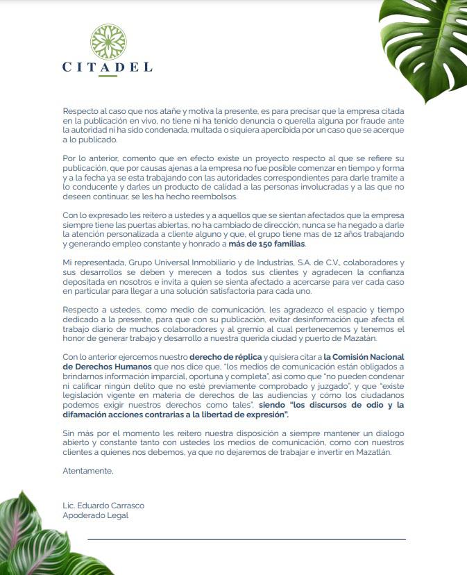 Grupo Universal Inmobiliario, por medio de su apoderado legal, Eduardo Carrasco, reiteró que para aquellos que se sientan afectados, la empresa tiene las puertas abiertas, tiene el mismo domicilio y nunca se ha negado a dar la atención personalizada a cliente, por lo que los invitó a acercarse para ver cada caso en particular.