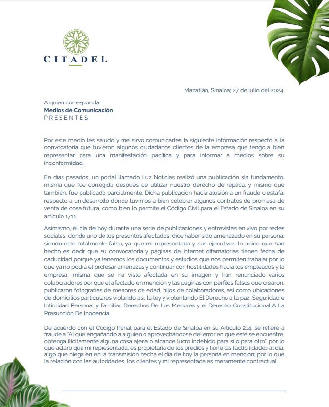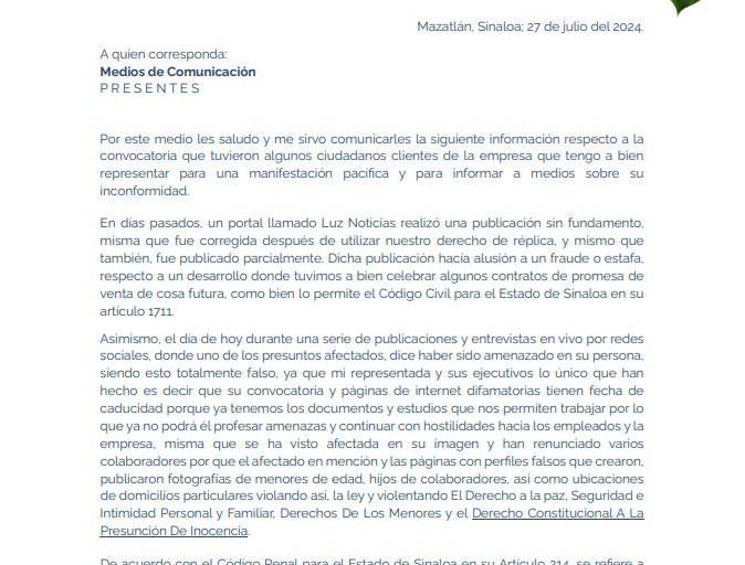 MAZATLÁN._ Luego de que el pasado sábado, compradores de lotes residenciales y departamentos en Mazatlán señalaron ser víctimas de un presunto fraude o estafa por parte del Grupo Universal Inmobiliario, la empresa involucrada lanzó un comunicado en donde informó que la empresa no tiene denuncias o sentencias relacionadas con este delito.