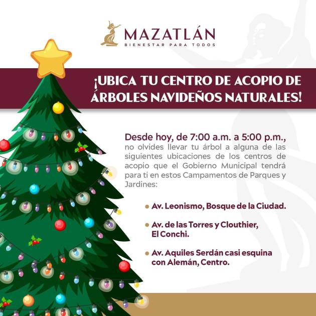 MAZATLÁN._ Ya se terminó la temporada navideña, ¿no sabes qué hacer con tu pinito natural?, ¡muy fácil!, el Gobierno Municipal de Mazatlán te invita a dejar tu arbolito navideño en uno de los tres centros de acopio instalados en la ciudad.