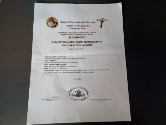 MAZATLÁN._ Ante la cercanía del Día de la Virgen de Guadalupe, la Orden Franciscana Seglar Región Inmaculada Concepción, invita a la ciudadanía a la peregrinación anual Franciscana al Santuario de Nuestra Señora de Guadalupe, que se realizará este domingo.