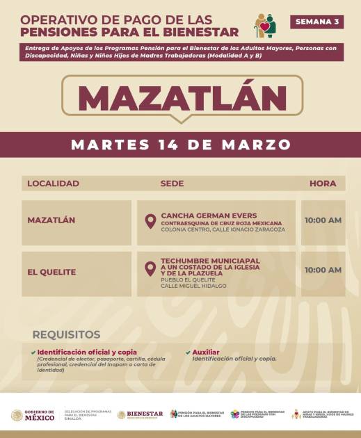 MAZATLÁN._ El Gobierno federal está pagando pensiones del Bienestar a los adultos mayores este martes en los municipios de Mazatlán, Mocorito, Concordia, Escuinapa, Guasave, Badiraguato y Sinaloa.